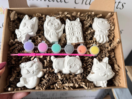 Mini Gabbys Dollhouse Inspired Craft Box • 7 Paint-Your-Own Figures • Kids Art Kit • Plaster Painting Set with Paints & Brush • Gift Box